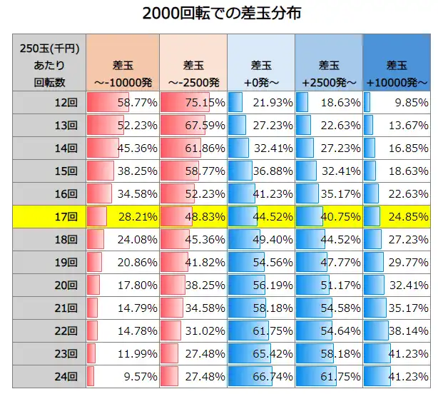 2000ゲーム・17回転/kでの投資中央値は40000円で、ミドルトップクラスの投資の低さとなります。大海5と比較すると2000円増えています。349ですが1日打ちやすい機種とは言えるので、評価は4.5としました。